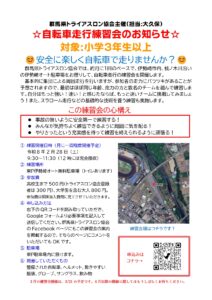 FEB282026 2月28日の土曜日に(概ね)小学3年生以上を対象にした自転車走行練習会を行います。いつもの通り伊勢崎オート東P駐車場です。9:30~11:30くらいでやります。まだまだ寒い日が続きますが、風を切って走りましょう! 申込Googleフォームはコチラ↓ https://docs.google.com/forms/d/1BVW6BEddSwAMGJSCCp3zFNHBt0JLE3KUAcBvMS8ewzM/edit